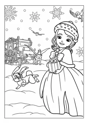 What It Is: This delightful winter-themed coloring page features Princess Sofia the First with a pre...