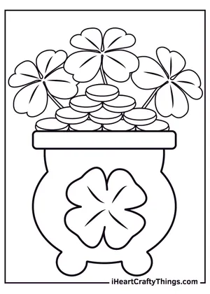 What It Is:This is a coloring activity sheet showcasing a pot of gold filled with coins and four-lea...