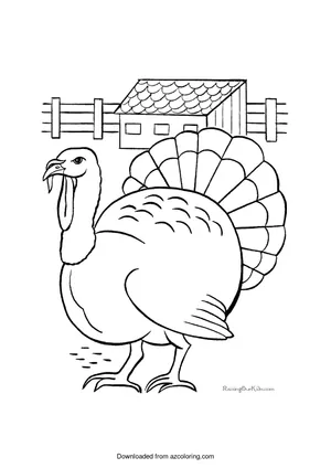 What It Is:This is a coloring sheet depicting a large turkey in front of a barn and a fence. The tur...