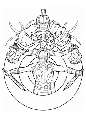 What It Is: This vibrant coloring page showcases Thor, Hela, and Hulk in a striking arrangement insp...