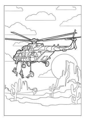 What It Is: A coloring activity featuring a military helicopter with soldiers descending from the ai...